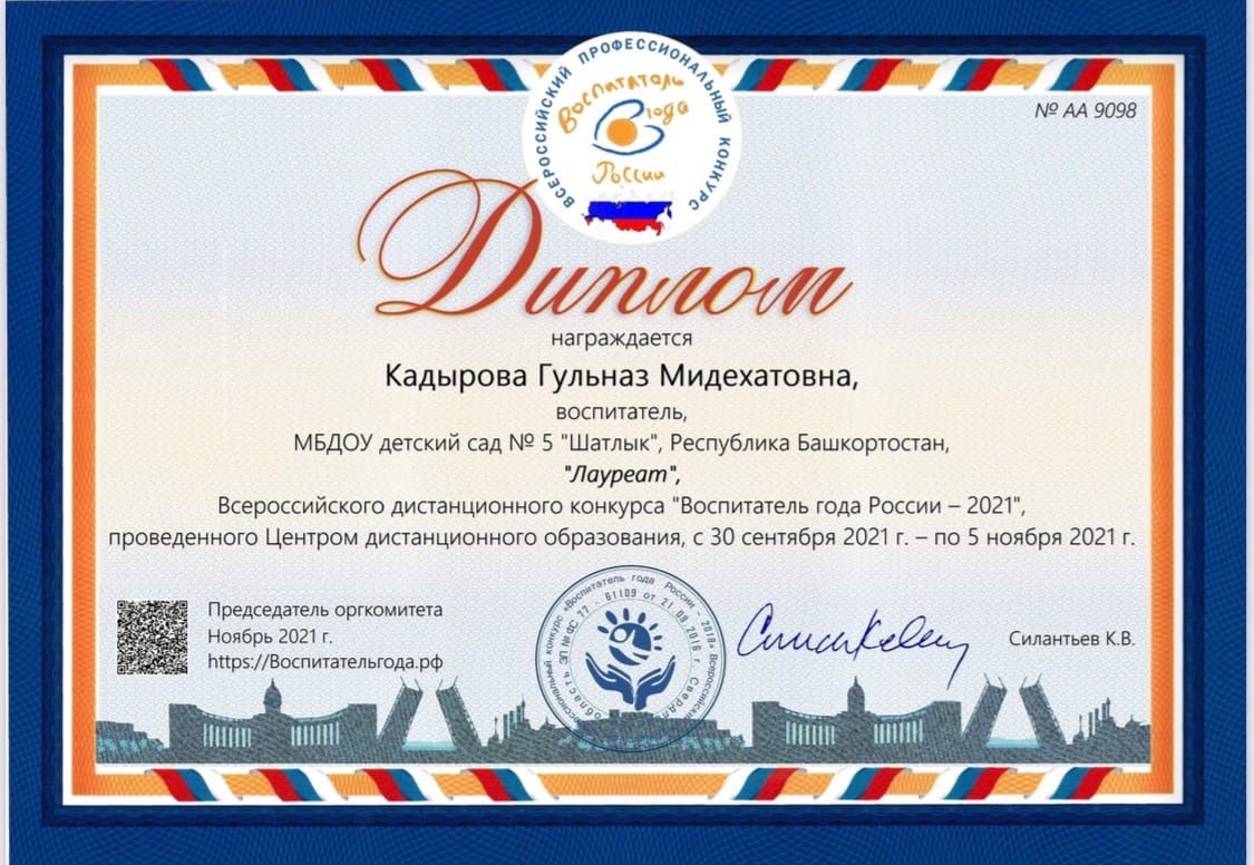Всероссийского дистанционного конкурса Воспитатель года 2021