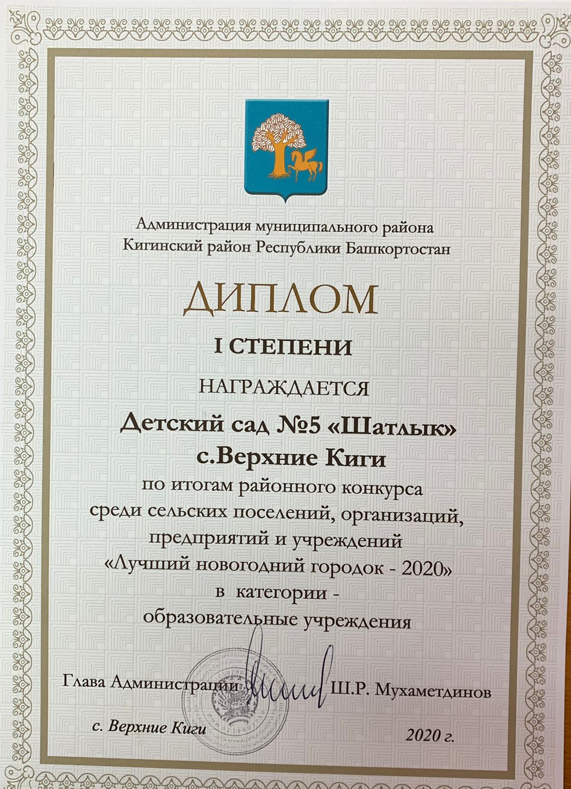 дипломом 1 степени награждается Детский сад №5 "Шатлык" с. Верхние Киги по итогам районного конкурса среди сельских поселений, организайий, предприятий и учреждений "Лучший новогодний городок-2020 в категории-Образовательные учреждения
