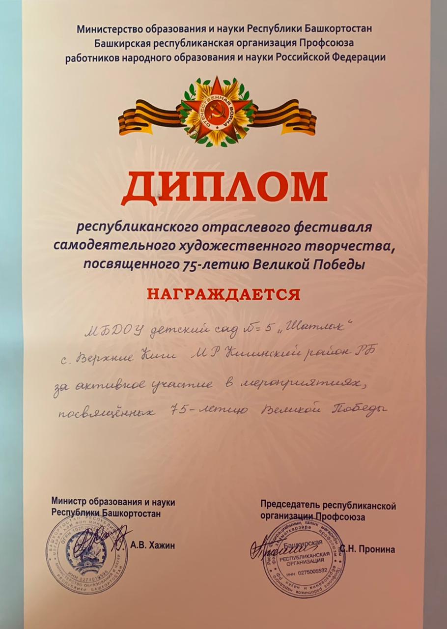 МБДОУ детский сад №5 "Шатлык" с. Верхние Киги МР Кигинский район РБ за активное участие в мероприятиях, посвященных 75 летию Великой Победы