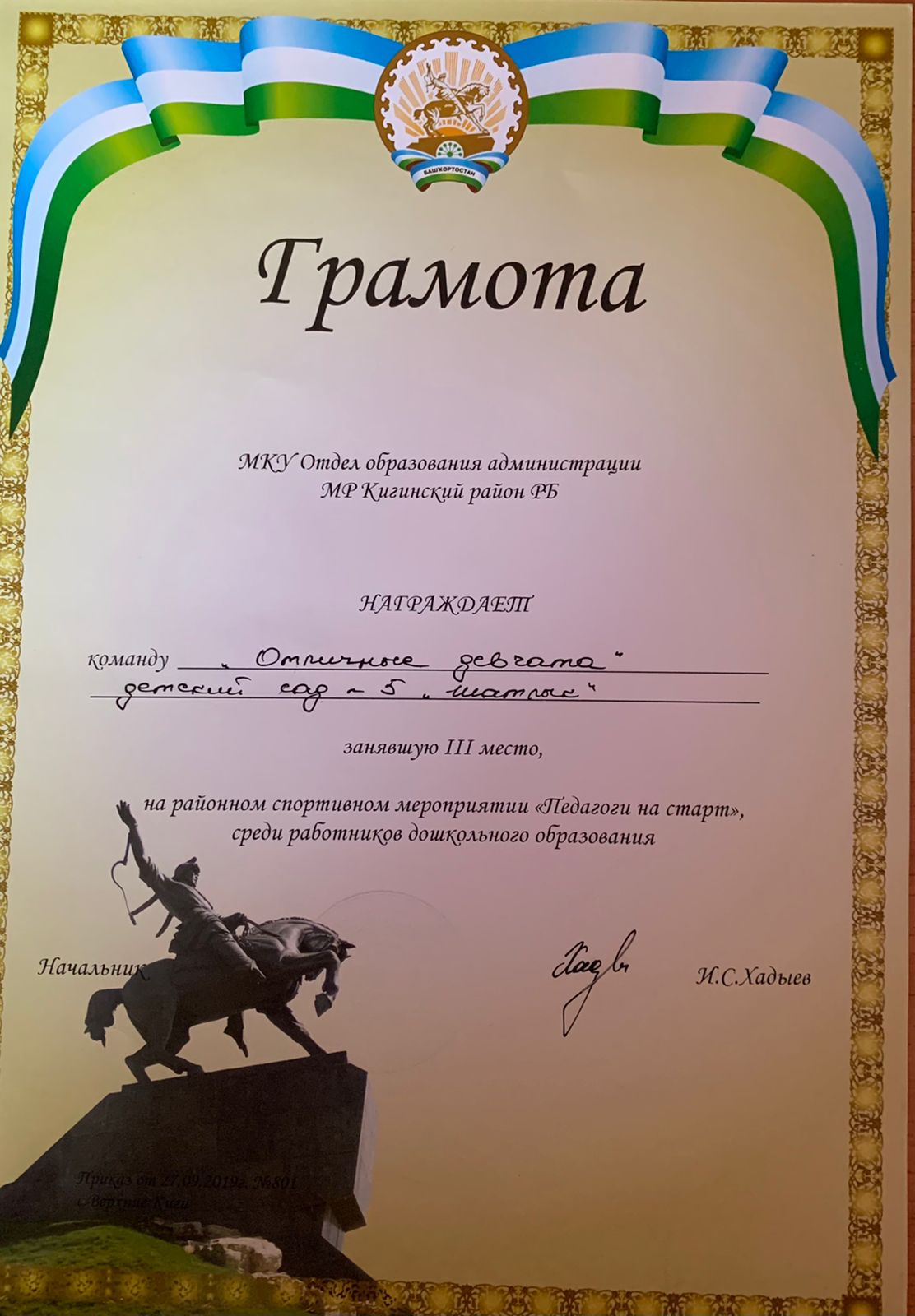 Награждает команду "Отличные девчата" детский сад №5 "Шатлык" занявшую 3 место на районном спортивном мероприятии "Педагоги на старт" среди работников дошкольного образования