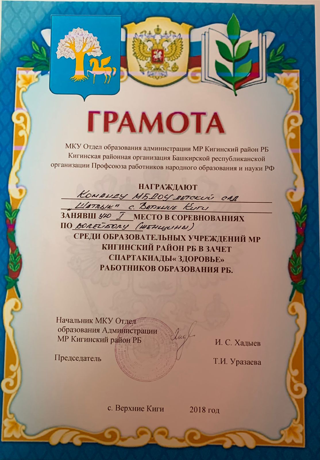 награждают Команду МБДОУ детский сад "Шатлык" с. Верхние Киги занявшую 1 место в соревнованиях по волейболу (женщины) среди образовательных учреждений МР Кигинский район РБ в зачет спартакиады "здоровье" работников образования РБ