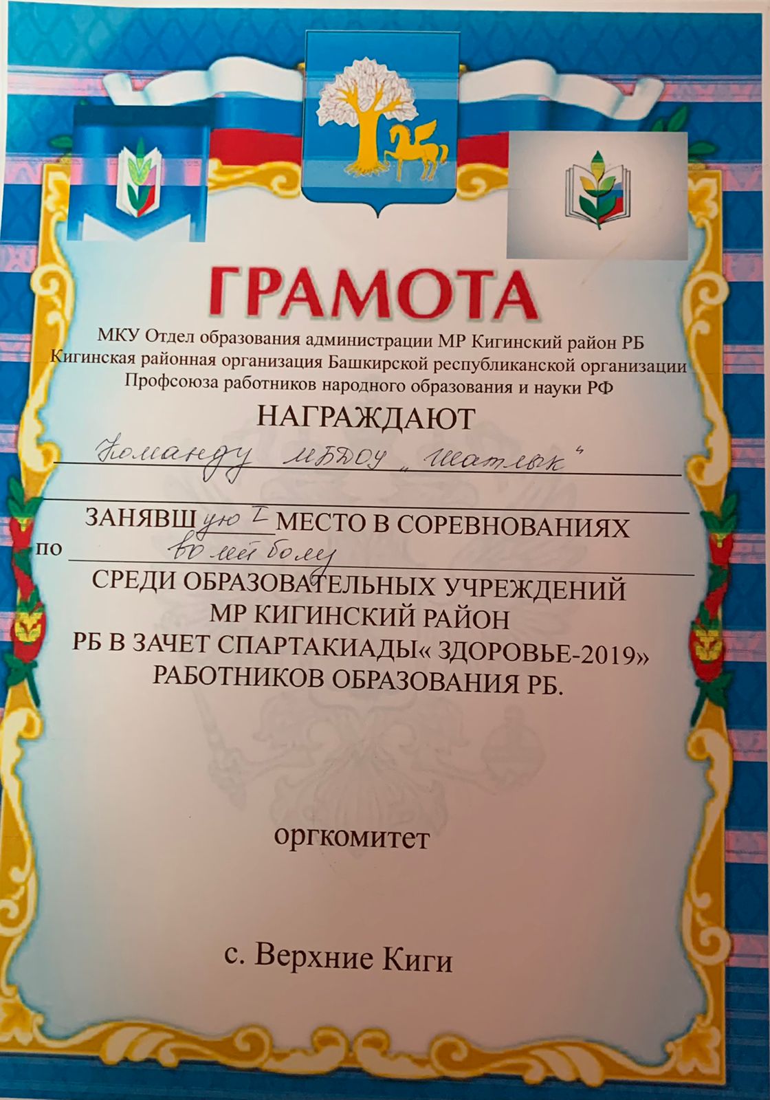 Награждают Команду МБДОУ «Шатлык» занявшую 1 место в соревнованиях по волейболу среди образовательных учреждений МР Кигинский район РБ в зачет спартакиады «Здоровье-2019» Работников образования РБ