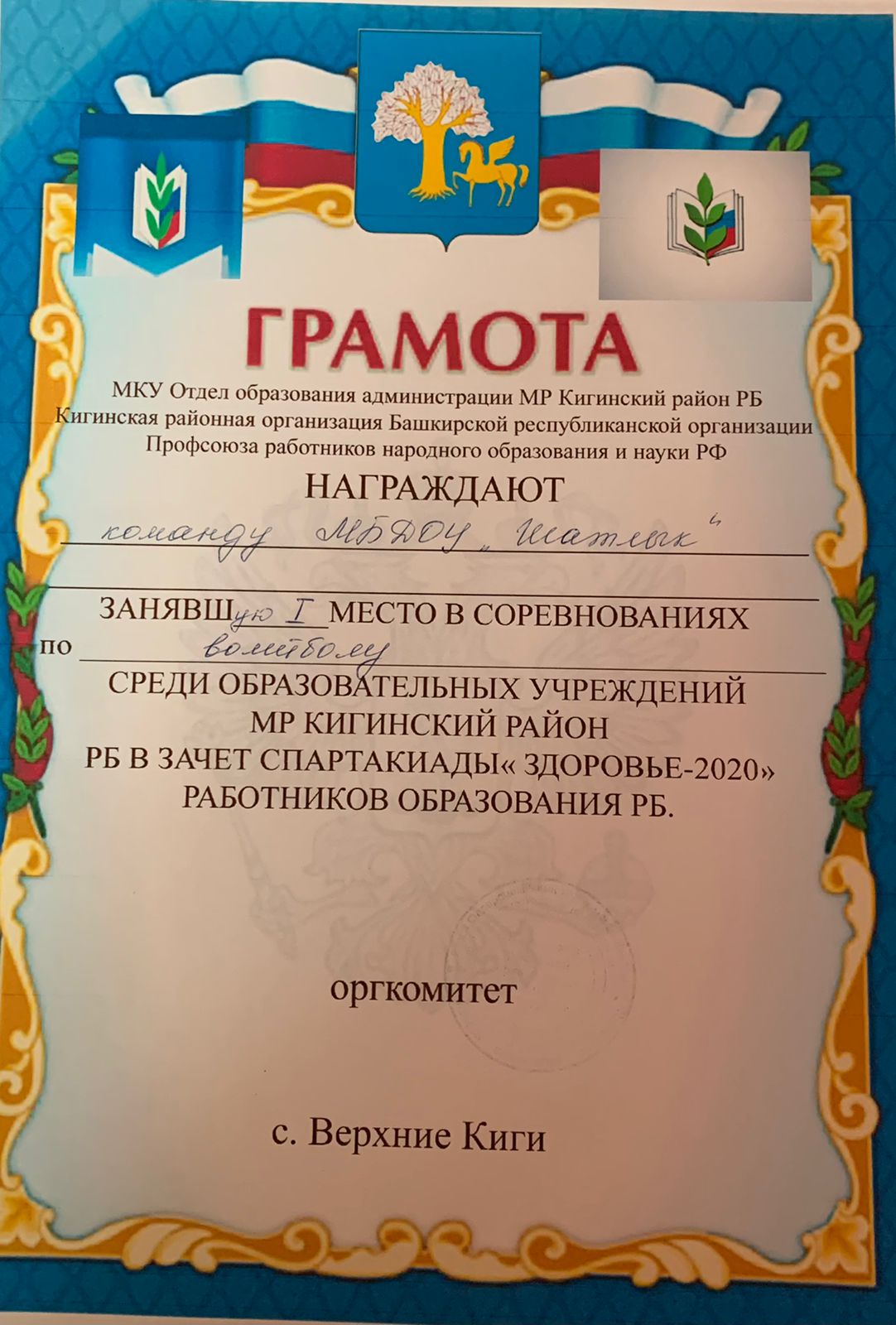 Награждают Команду МБДОУ «Шатлык» занявшую 1 место в соревнованиях по волейболу среди образовательных учреждений МР Кигинский район РБ в зачет спартакиады «Здоровье-2020» Работников образования РБ